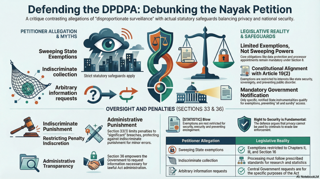Further the purpose related to prevention, detection, investigation or prosecution of any offence or contravention of any law for the time being in force in India is directly pointing to constitutional exceptions under Article 19(2) which even Justice Puttaswamy Judgement has recognized. Limited exemptions related to exceptions under Constitutions cannot be called “Sweeping exemptions”. If the petitioner is serious, we can also state that they are making sweeping statements to mislead the Court and implying speculative fears which does not exist.
